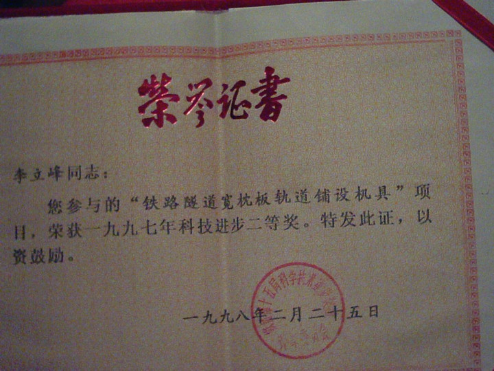 李立峰参与的铺轨机项目荣获1997年科技进步二等奖